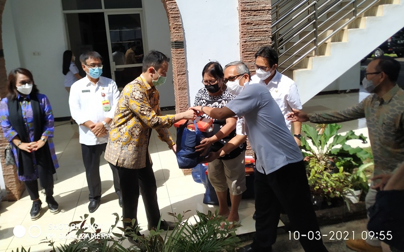 Bantuan sembako untuk korban bencana diserahkan secara seremoni ke warga di Kantor Disperindag Sulut, Selasa (9/3/2021)