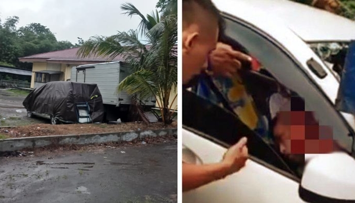 Tiba tiba datang mobil boks dari arah belakang. Mobil itu hilang keseimbangan dan menabrak mobil Avansa tersebut.
