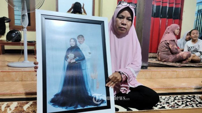 Foto : Yayak Dwi Ernawati, ibu mertua Pandu memegang foto Serda Ede Pandu Yudha Kusuma bersama istrinya, merupakan operator senjata 2 di KRI Nanggala 402 yang dinyatakan hilang kontak di perairan Bali Utara sejak, Rabu (21/4). Anggota TNI AL Pandu baru dua bulan menikah dengan Mega Dian Pratiwi, seorang bidan Puskesmas Klatak, warga Desa Ketapang, Kecamatan Kalipuro. SURYA/JOHAN HARI (SURYA/SURYA/JOHAN HARI)
