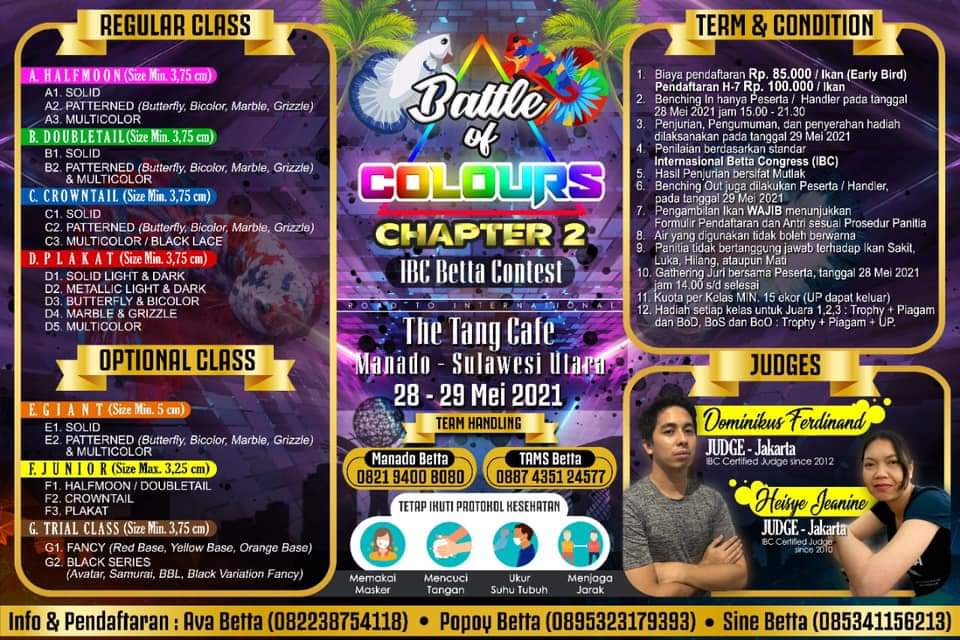 TRIBUNMANADO.CO.ID, Manado – Kontes Ikan Cupang Battle of Colours Chapter 2 akan digelar pada 28-29 Mei 2021 di The Tang Café, Kota Manado, Sulawesi Utara.