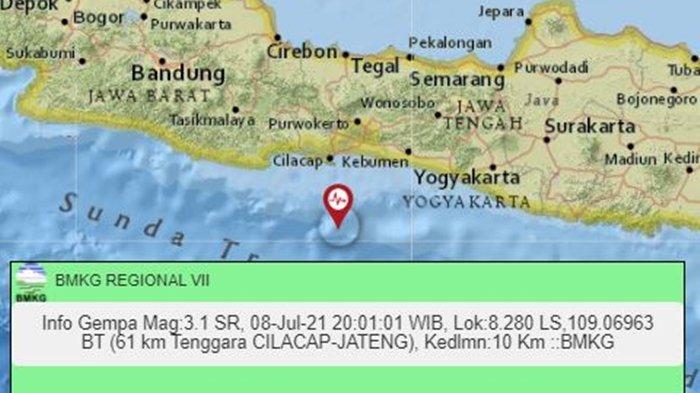 Menurut Badan Meteorologi Klimatologi dan Geofisika (BMKG) gempa bumi ini terjadi Cilacap, Jawa Tengah pukul 20:01 WIB, Kamis (8/7/2021).