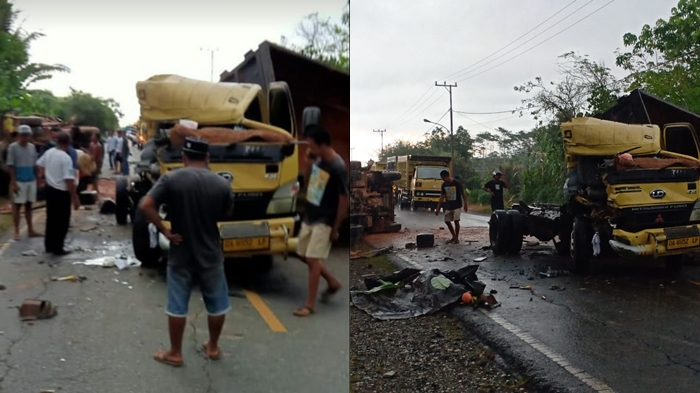 Truk KH 8304 BM sampai terbalik ke kiri jalan. Sementara truk KH 8952 LF rusak parah di bagian kemudi hingga bak truk terlepas.