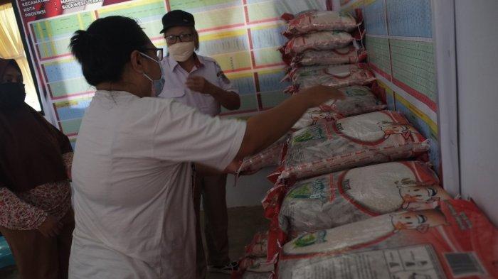TRIBUNMANADO.CO.ID, Manado - Warga menerima beras di Kantor Lurah Taas, Manado, Sulawesi Utara, Senin (26/7/2021).