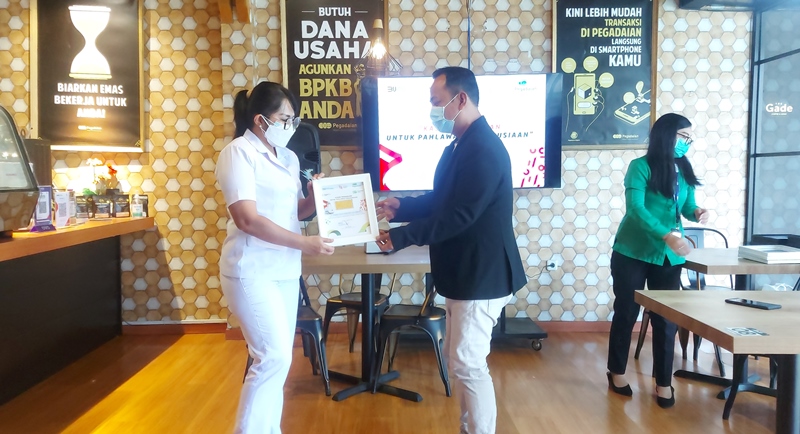 TRIBUNMANADO.CO.ID, Manado - Dalam rangka memeriahkan HUT Ke 76 RI tahun 2021 PT Pegadaian Persero Area Manado memberikan penghargaan kepada para Tenaga Kesehatan.