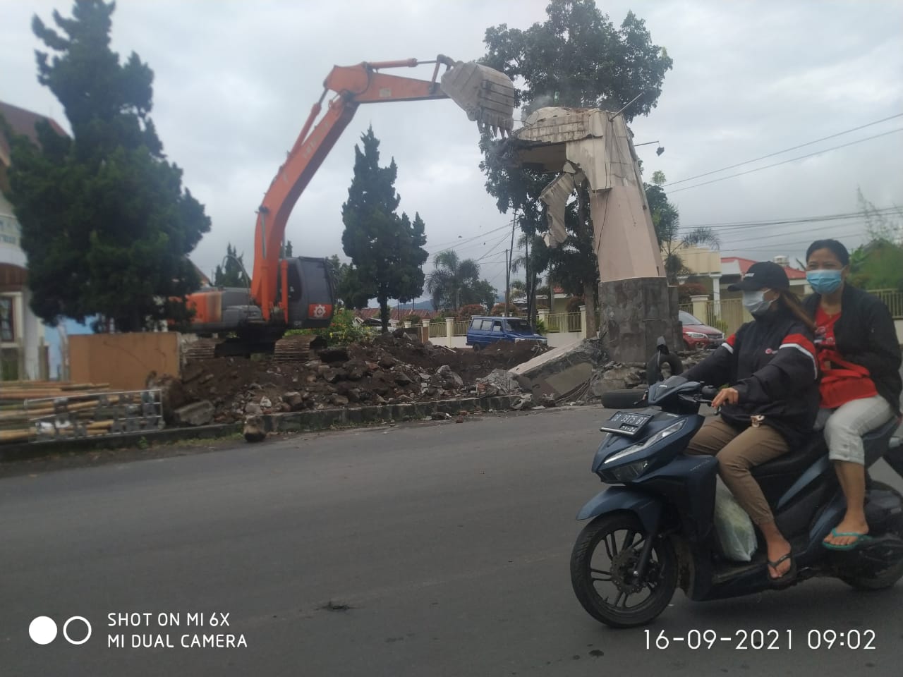 Kemudian, dudukan patung mulai dihancurkan dengan ekskavator.