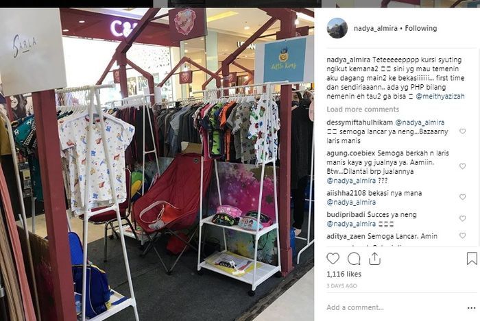 Dikutip dari TribunJatim, Nadya Almira jual baju anak-anak dagangannya secara online di instagram.