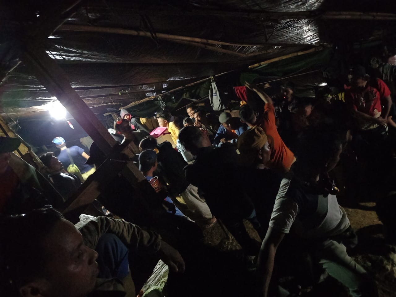 Proses evakuasi dilakukan oleh sesama penambang dengan menggunakan mesin pengangkat material.