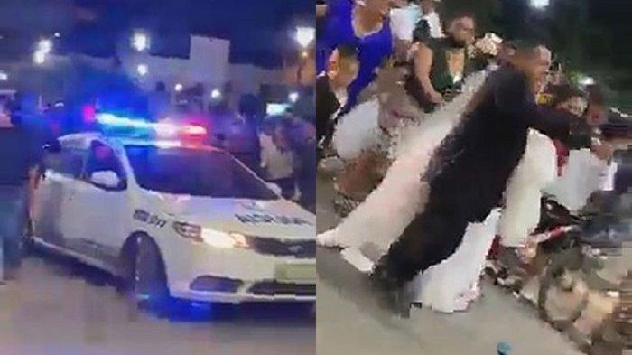 Aparat lalu menarik pengantin pria turun dari mobil pengantin dan membawanya menggunakan mobil polisi.