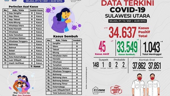 Pada Selasa (07/12/2021), kasus terkonfirnasi positif di Sulawesi Utara tercatat 11 kasus baru.