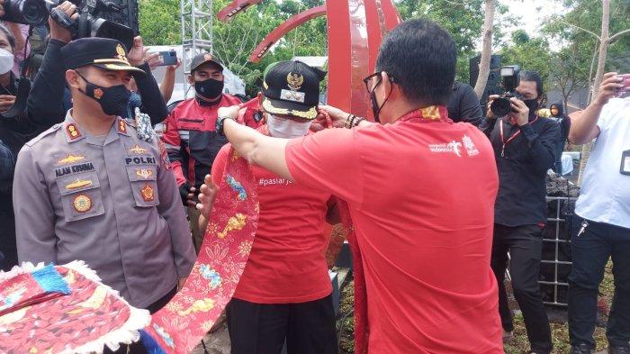 Menteri Parekraf kemudian dipasangkan kain batik khas Bitung warna Bitung, dari Duta Pariwisata.