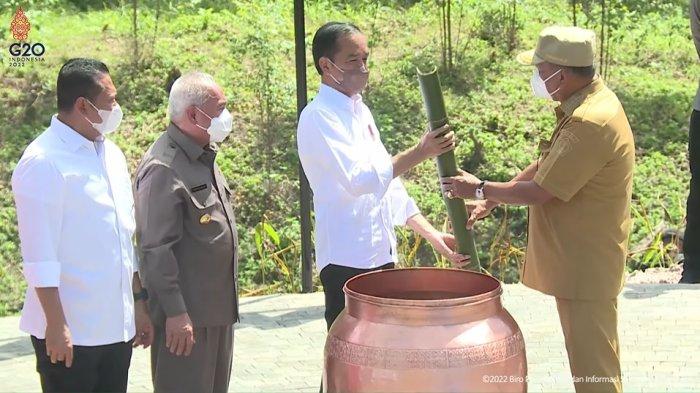 Kemudian, air yang diserahkan kepada Presiden Jokowi ditaruh dalam batang bambu hijau.