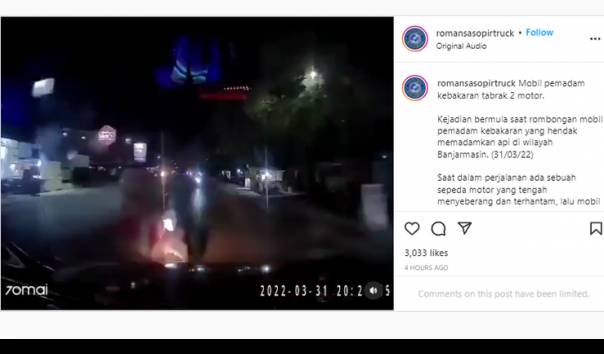 "Saat dalam perjalanan ada sebuah sepeda motor yang tengah menyeberang dan terhantam, lalu mobil damkar banting ke kanan dan kembali menghantam sepeda motor yang lain," tulis keterangan video, dikutip Sabtu (2/4/2022).