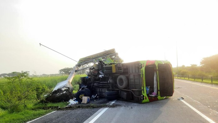 Kecelakaan maut yang menyebabkan bus pariwisata Ardiansyah terguling, terjadi di Tol Surabaya-Mojokerto KM712.400/A pada Senin (16/5/2022) sekitar pukul 06.15 WIB.