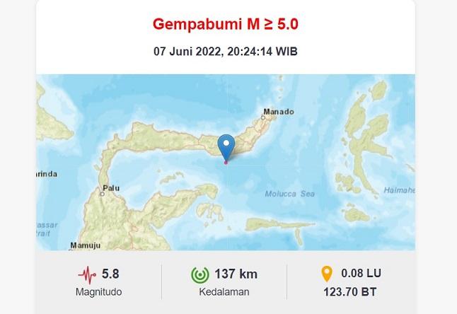 Gempa Magnitudo 5,8 Guncang Bolsel-Sulut Selasa 7 Juni 2022 Malam, Tidak Berpotensi Tsunami
