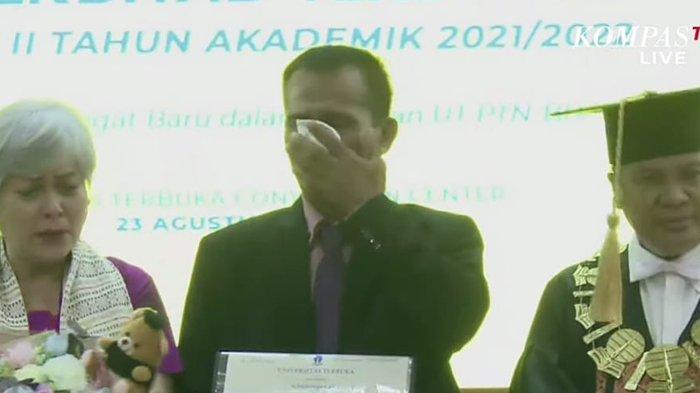 Foto: Para wisudawan ikut menangis saat menyaksikan momen Samuel Hutabarat mewakili Brigadir J menerima ijazah saat acara wisuda Universitas Terbuka.