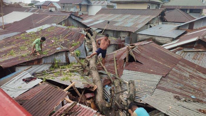Dua Rumah Warga di Kelurahan Sindulang, Kecamatan Tuminting, Kota Manado, Sulawesi Utara rusak akibat tertimpa pohon.
