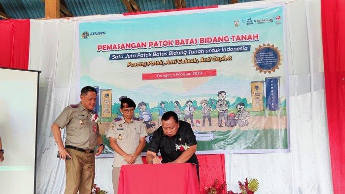 TRIBUNMANADO.CO.ID, MINAHASA - Kementerian Agraria dan Tata Ruang/Badan Pertanahan Nasional (ATR/BPN) menggelar pencanangan Gerakan Masyarakat Pemasangan Tanda Batas (Gemapatas) yang gelar di Desa Toraget, Kecamatan Langowan Utara, Kabupaten Minahasa, Sulawesi Utara, Jumat (3/2/2023).