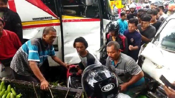 Bus kemudian menabrak mobil pickup yang tengah mengangkut sayur.