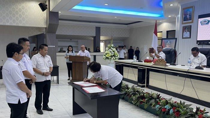 Pelaksanaan serah terima jabatan berlangsung di Ruang Sidang Lantai 4 Kantor Wali Kota Bitung, Sulawesi Utara.