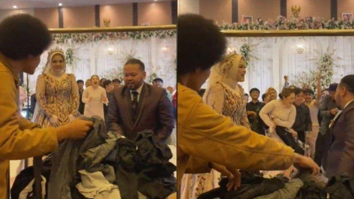 Sebuah video acara pernikahan pasangan pengantin bagi-bagi baju bekas, viral di media sosial.