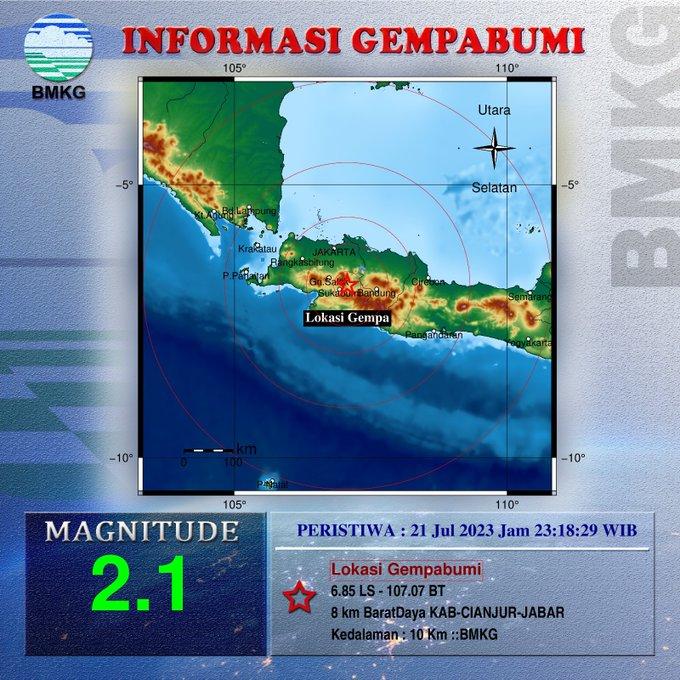 Info Gempa Mag:2.1, 21-Jul-23 23:18:29 WIB, Lok:6.85 LS - 107.07 BT (8 km BaratDaya KAB-CIANJUR-JABAR), Kedlmn: 10 Km ::BMKG
