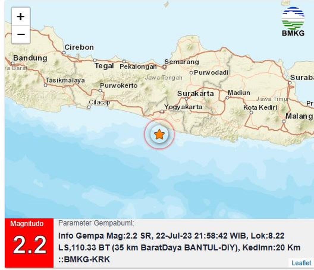 Info Gempa Mag:2.2, 22-Jul-23 21:58:42 WIB, Lok:8.22 LS,110.33 BT (35 km BaratDaya BANTUL-DIY), Kedlmn:20 Km ::BMKG-KRK