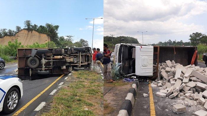 Truk tersebut terbalik melintang.