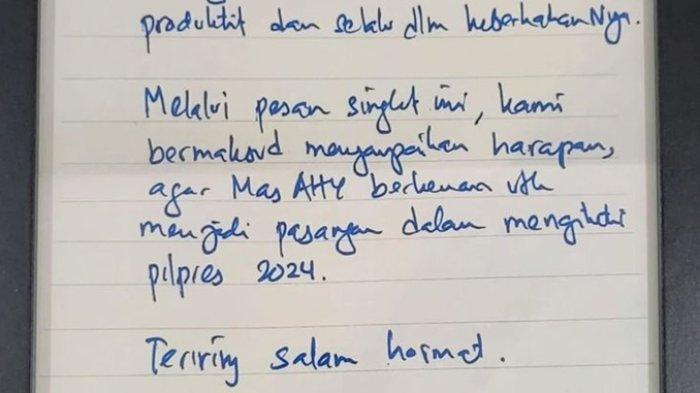 Melalui pesan singkat ini, kami bermaksud menyampaikan harapan agar Mas AHY berkenan untuk menjadi pasangan dalam mengikuti Pilpres 2024.