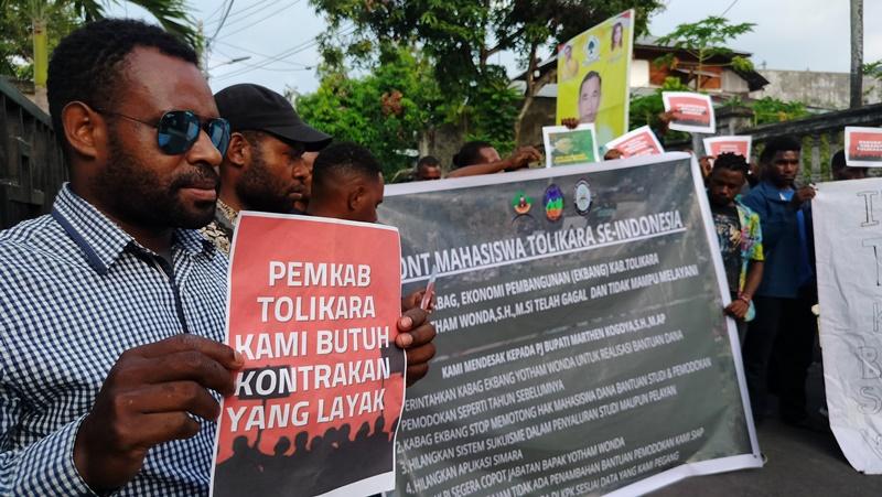 Puluhan mahasiswa Tolikara, Provinsi Papua, menggelar demonstrasi di Manado, Sulawesi Utara, Senin 30 Oktober 2023.