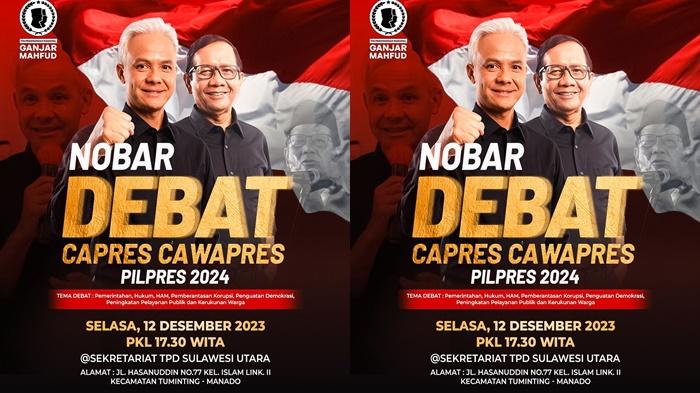 Manado, TRIBUNMANADO.CO.ID - Tim Pemenangan Daerah Ganjar Pranowo - Mahfud MD di Sulawesi Utara akan gelar nobar debat pertama Capres Cawapres Pemilu 2024.