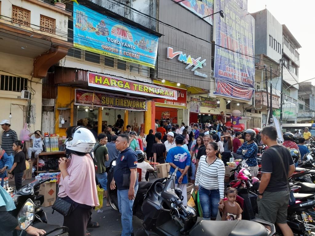 Di sana berjejer toko-toko yang banting harga kembang api.