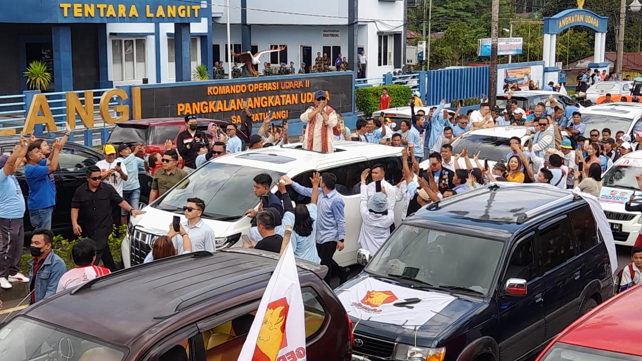 Prabowo Subianto disambut pendukungnya yang sudah menyemut di seputaran bandara Sam Ratulangi Manado, Senin (5/2/2024) sekira pukul 10.50 Wita.