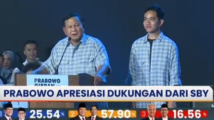 Manado, TRIBUNMANADO.CO.ID - Paslon capres cawapres nomor urut 2, Prabowo Subianto - Gibran Rakabuming unggul sementara berdasarkan quick count sejumlah lembaga survei atas hasil Pemilu 2024, Senin (14/2/2024).
