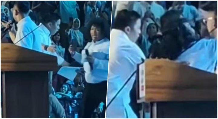 Dalam video tersebut, Mayor Teddy tiba-tiba mendekati panggung dan menghampiri Marshel yang sedang berfoto bersama Gibran Rakabuming.