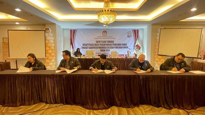 Pelaksanaan rapat pleno rekapitulasi penghitungan suara tingkat Kabupaten Minahasa Selatan akhirnya selesai pada, Senin 4 Maret 2024.