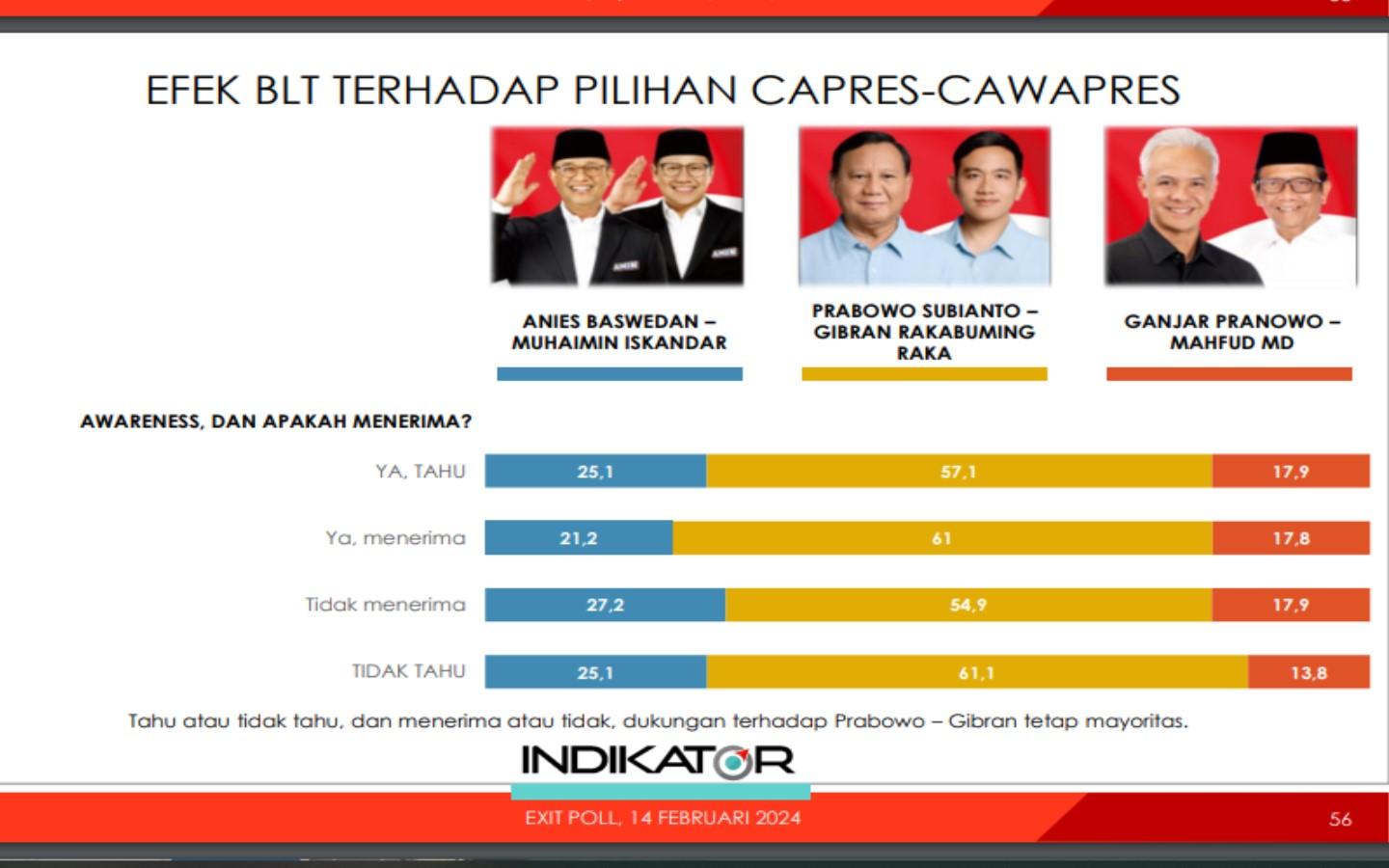 Exit poll Indikator yang dilakukan saat hari pencoblosan 14 Februari 2024 menunjukkan, Prabowo-Gibran menang di pemilih tak terima bansos-BLT.