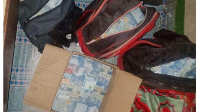 Penampakan tas dan kardus berisi uang Rp 3 miliar yang sempat didokumentasikan sebelum berubah jadi daun kering.(KOMPAS.COM)