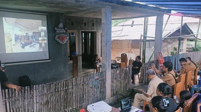Layar proyektor nampak terpasang di tembok teras rumah dan menayangkan pertemuan daring yang dipancarkan dari proyektor warna putih.