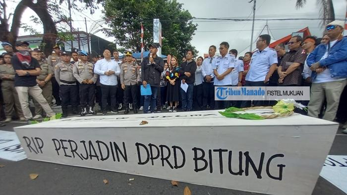 | Aksi Simbolis Demo di Bitung: Letakkan Peti Jenazah, Desak Kejelasan Kasus Korupsi Perjadin DPRD |   |
