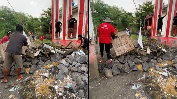 Sejumlah pria, baik pemuda dan bapak-bapak bahu-membahu menyingkirkan batu-batu besar di depan gerban TPA Sumompo.