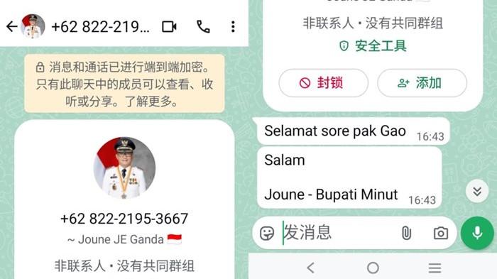 - Beredar WA mengatasnamakan Bupati Kabupaten Minahasa Utara (Minut) Joune Ganda.