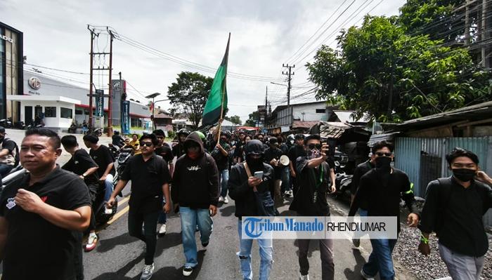 Dalam iring-iringan menuju Kantor DPRD Sulut, massa terlihat serba berpakaian warna hitam.