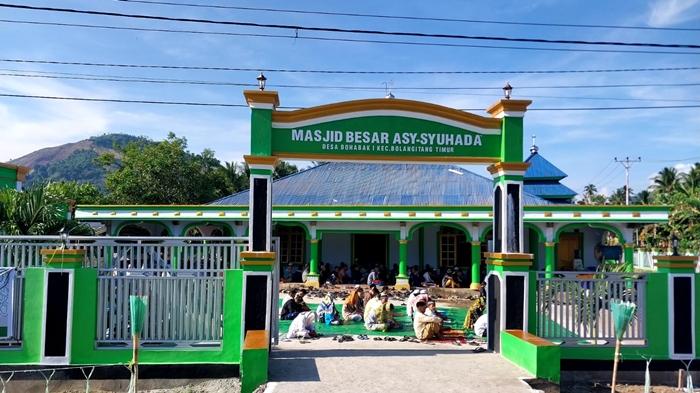 Umat Muslim di Desa Bohabak mengikuti Salat Idul Fitri di Masjid Besar Asy-Syuhada.