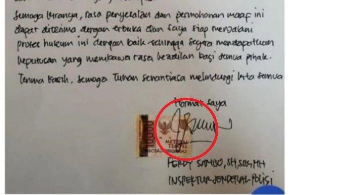 Surat permintaan maaf Ferdy Sambo di atas kertas, fotonya tersebar di media sosial, sesaat sebelum menjalani sidang kode pelanggaran etik